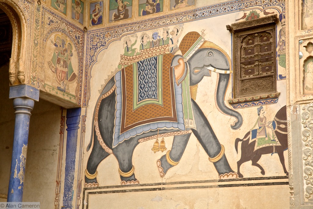 So what did they see - Hephalents, that's what, well pictures of them. These are painted on the walls of merchants' houses or Havellis. These Havellis were built about a century ago by merchants who had come from Mandawa and moved to Delhi to make their fortunes. Over the years the houses have become poorly maintained, but now they are being done up again. The main feature of the houses is the wonderful paintings. I particularly like the hephalents, don't you? They all seem to have a monkey riding on their backs and someone with a blue face, a bit strange, but fun. (You have to read the Ramayana to understand, but the monkey is Hanuman and the blue face person is Vishnu who came to earth as Rama, and had all sorts of battles with the demons in Lanka, helped by his brother and his friend Hanuman.) Too much detail I just wished I'd seen them.Then there are other fun paintings. This one shows a strongman who famously held back a motor car.